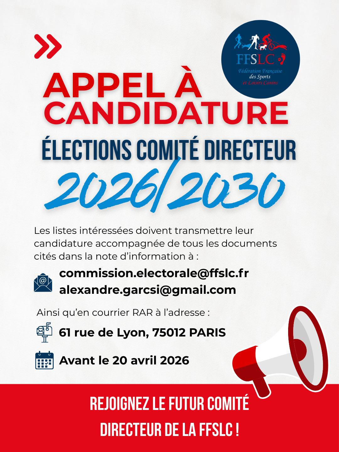 La Fédération Française des Sports et Loisirs Canins ouvre officiellement l’appel à candidatures pour l’élection du prochain Comité Directeur, pour la mandature...